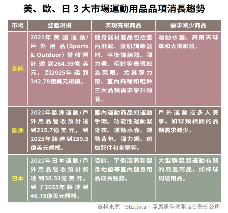 亞馬遜網站主要將運動用品分成室內運動、專業運動和戶外用品三大類商品,2020年在COVID-19疫情影響之下,包括美國、歐洲與日本三大市場在三大類商品中,同樣呈現室內健身顯著成長、戶外以群聚使用的運動類型用品銷售明顯減少,只是不同區域市場的消長,會因為各別區域市場對於運動喜好的差異而有些微差距。