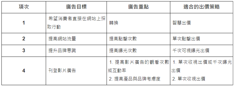 如果企業是刊登影片廣告,目標希望提高廣告的觀看次數或互動率,可以採用單次收視出價或千次曝光出價。如果刊登影片廣告的目標是提高產品與品牌考慮度,則可採用單次收視出價。